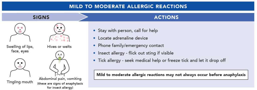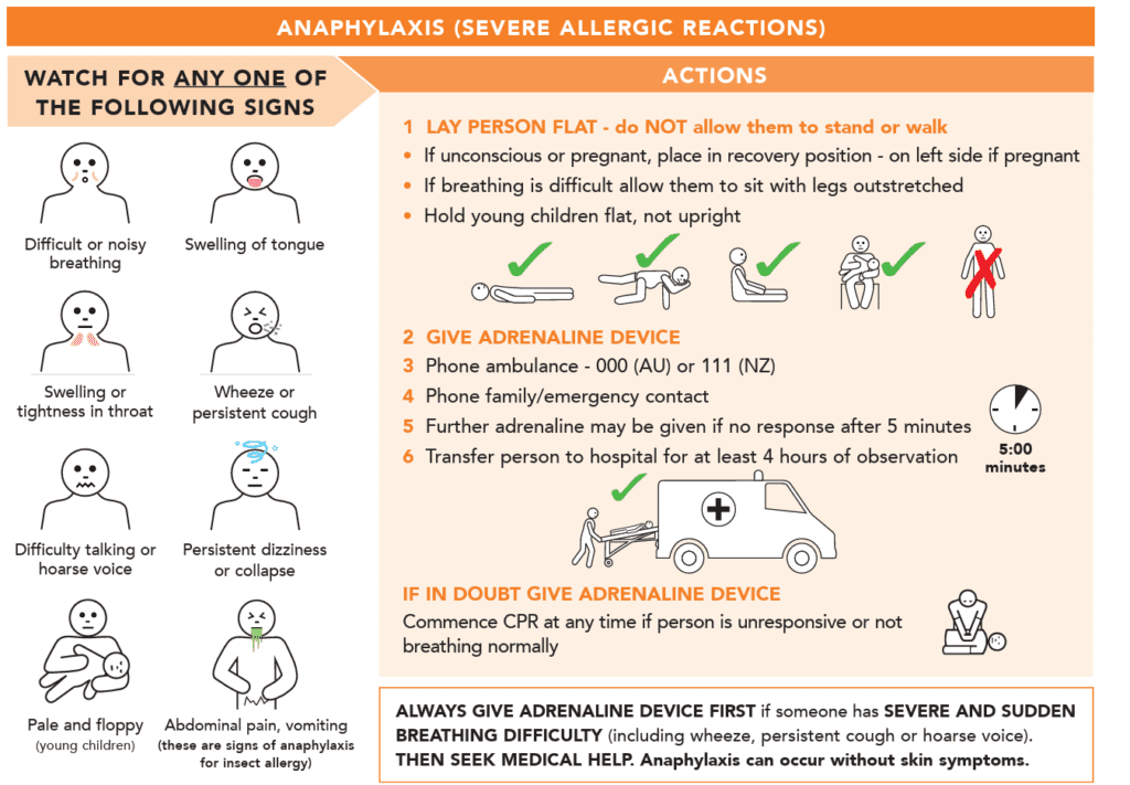 Below are infographics from ASCIA (Australasian Society of Clinical Immunology and Allergy) – “First Aid Plan for Anaphylaxis,” that detail the signs of a mild-to-moderate allergic reaction and anaphylaxis (severe allergic reaction), and what to do in the event of each. You can download the poster here.